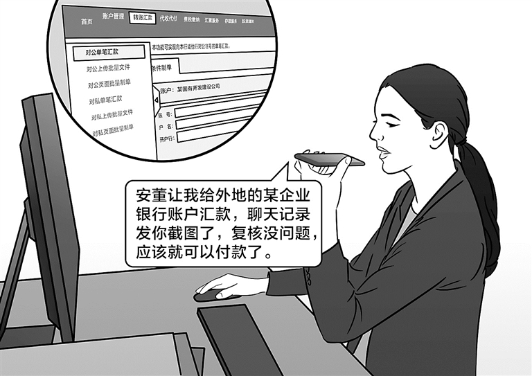 隨后,黃某某被拉入一個(gè)聊天群,并在該群收到備注名為安某某(該公司董事長)發(fā)來的消息,詢問黃某某是否接到銀行需要年檢的通知,并在聊天群中“安排公司相關(guān)工作”,這讓黃某某輕信了安某某的身份。隨即,安某某要求黃某某向外地某企業(yè)銀行賬戶匯款。