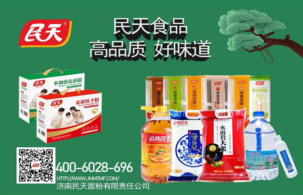 濟南民天面粉有限公司是隸屬于濟南產(chǎn)發(fā)集團的三級全資公司,在濟南已有56年歷史,現(xiàn)在承擔(dān)濟南市應(yīng)急面粉儲備與配送任務(wù),已獲得山東老字號,中國名牌,中國馳名商標(biāo),國家農(nóng)業(yè)產(chǎn)業(yè)化重點龍頭企業(yè),糧食行業(yè)功勛企業(yè),濟南市區(qū)域農(nóng)產(chǎn)品品牌“泉水人家”授權(quán)使用企業(yè)。現(xiàn)在面臨由單一等級面粉原料企業(yè)向食品深加工產(chǎn)業(yè)轉(zhuǎn)型的歷史節(jié)點。產(chǎn)品升級:等級面粉向?qū)S妹娣凵?,面粉向深加工特色掛面、速凍濕面胚,速凍米面食品、烘培食品、速食蛋白沖調(diào)品、調(diào)味品、高鍶弱堿性山泉水、高端火山巖大米、稻花香五號大米,東北長粒香大米,月子小米、黃金小米、水餃粉,水餃調(diào)味料,水餃醋,水餃醬油,廚房專用水,保濕噴霧化妝離子水。